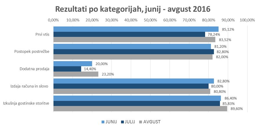 mystery-shopping-gostinski-lokali-rezultati-po-kategorijah-avgust-2016Graf 2: Rezultati po kategorijah, junij – avgust 2016, Vir: Skrivnostni nakup d.o.o.