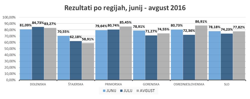 Regijsko so se v povprečju najbolj odrezali v osrednji Sloveniji, sledijo jim Primorci, na tretjem mestu so se znašli Dolenjci, na četrtem, predzadnjem mestu, gostinci na Gorenjskem, na zadnjem pa, pregovorno najbolj gostoljubni, Štajerci. Morda lahko vzroke temu pripišemo splošnemu slabemu gospodarskemu stanju v tej regiji. Skupno povprečje vseh regij je bilo 77,82%, kar pomeni, da je še kar nekaj rezerv.