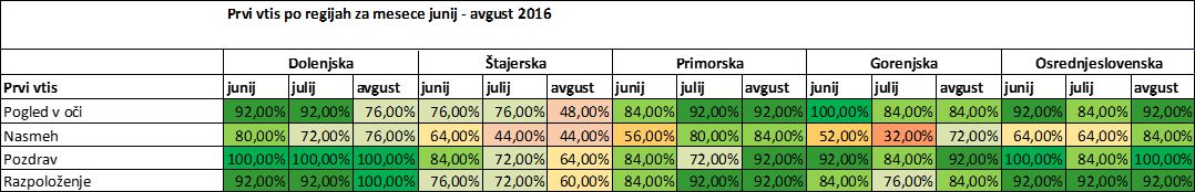 Tabela 1: Prvi vtis po regijah za mesece junij – avgust 2016, Vir: Skrivnostni nakup d.o.o.